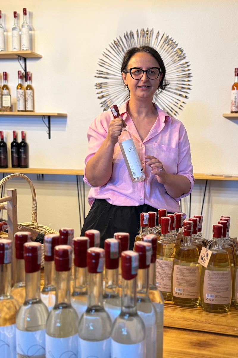 Efter att ha botaniserat bland såväl lädervaror som smycken åker vi till Risons, ett destilleri och vineri som drivs av Butrint och Ylle Byci.