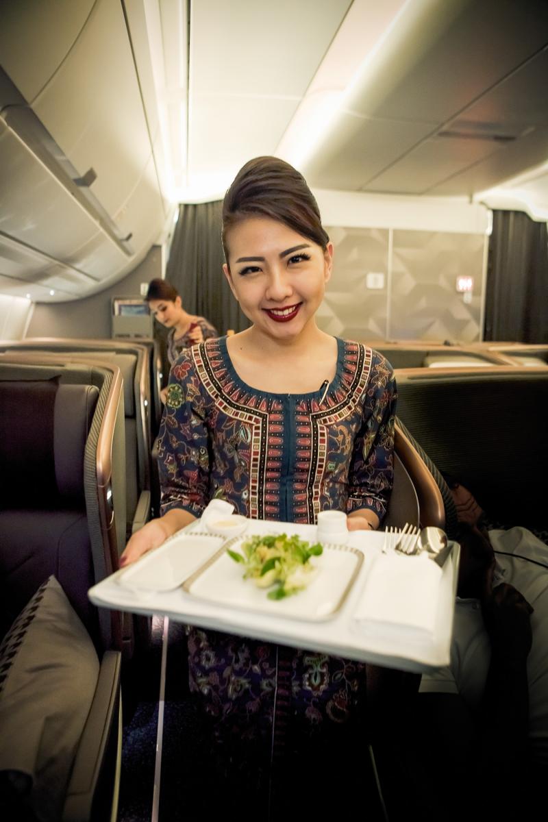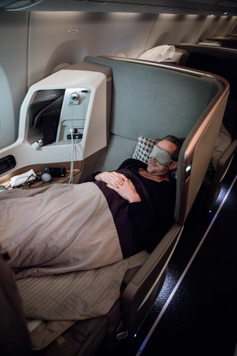 Efter ett par dagars jobb i Singapore och med ett hektiskt schema i NYC känner jag redan innan jag gått på planet hur jag behöver sova. Och jag funderar lite på hur jag ska lyckas landa i NYC utvilad med tanke på den 13 timmars tidsskillnad det är mellan städerna. Den här rutten är verkligen som att kliva in i en gigantiskt teleportör – du går in i planet vid midnatt och vaknar på morgonen samma dag på andra sidan jorden. Min plan är att försöka vänta lite med att sova för att få mina åtta timmars skönhetssömn så nära NY-tid som möjligt men när jag nu lutar huvudet tillbaka och sträcker ut mina ben i den fantastiska businessfåtöljen funderar jag snarare på om jag ska lyckas ta mig genom första rätten i middagsserveringen.