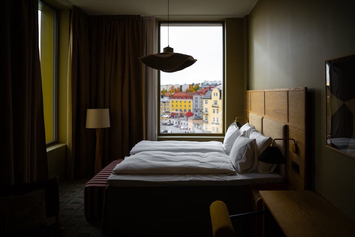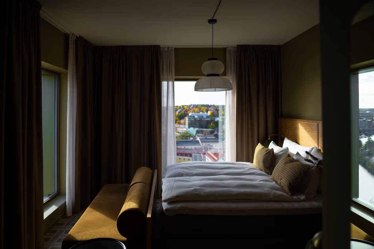 Hotellet reser sig 14 våningar över stadens silhuett, och både rum och gemensamma ytor har formgivits med nordisk enkelhet, naturliga material och harmoniska färgtoner i fokus. Generösa fönster gör kanalen och staden till en självklar del av upplevelsen, som också bär tydliga spår av retroinspirerade detaljer och internationella influenser.