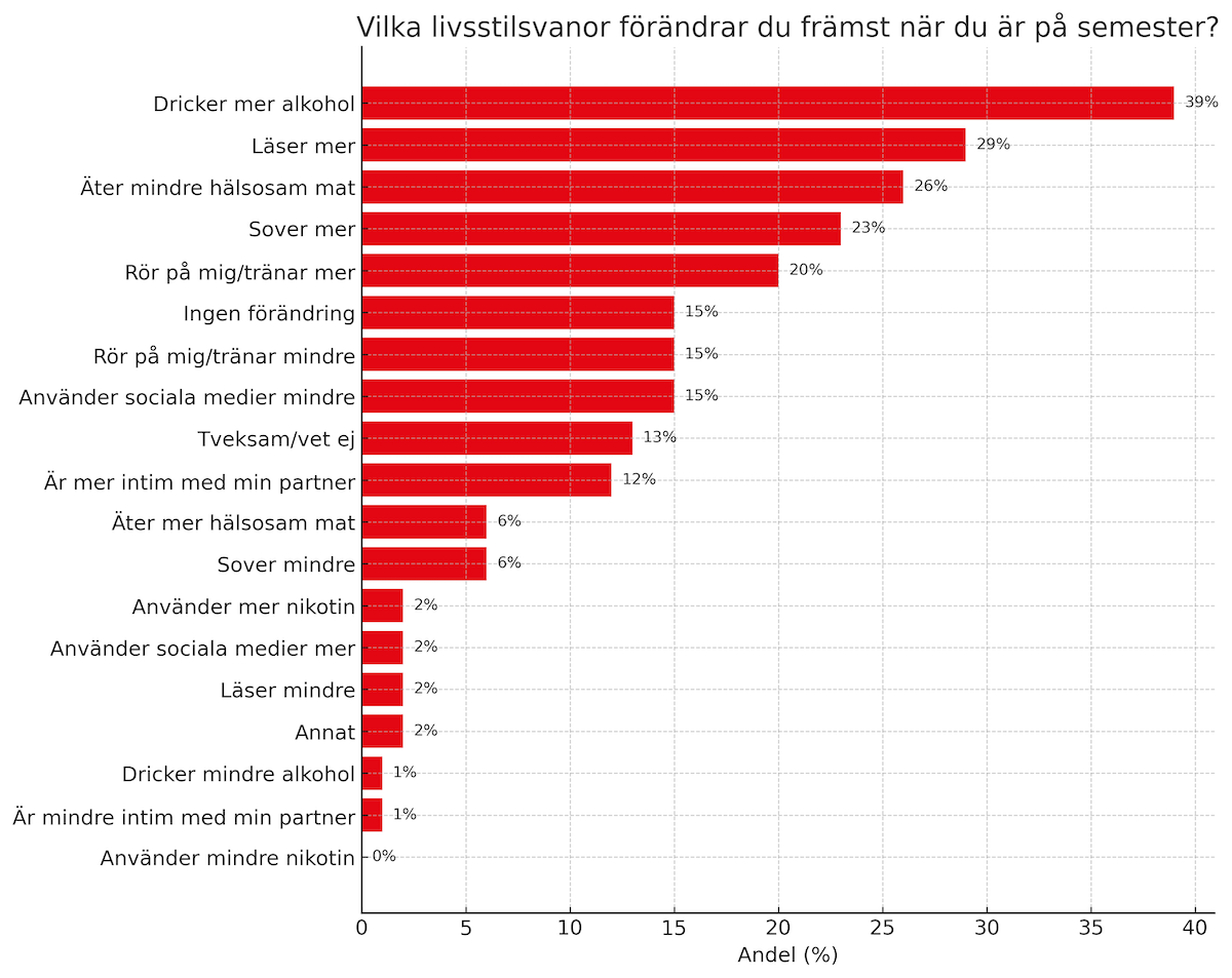 Undersökningen visar också att 20 procent rör sig mer under semestern, medan 15 procent rör sig mindre. Bara 15 procent uppger att de inte ändrar sina livsstilsvanor alls under resan. För de flesta innebär semestern alltså en tydlig brytpunkt med både vila, återhämtning – och mer frihet.