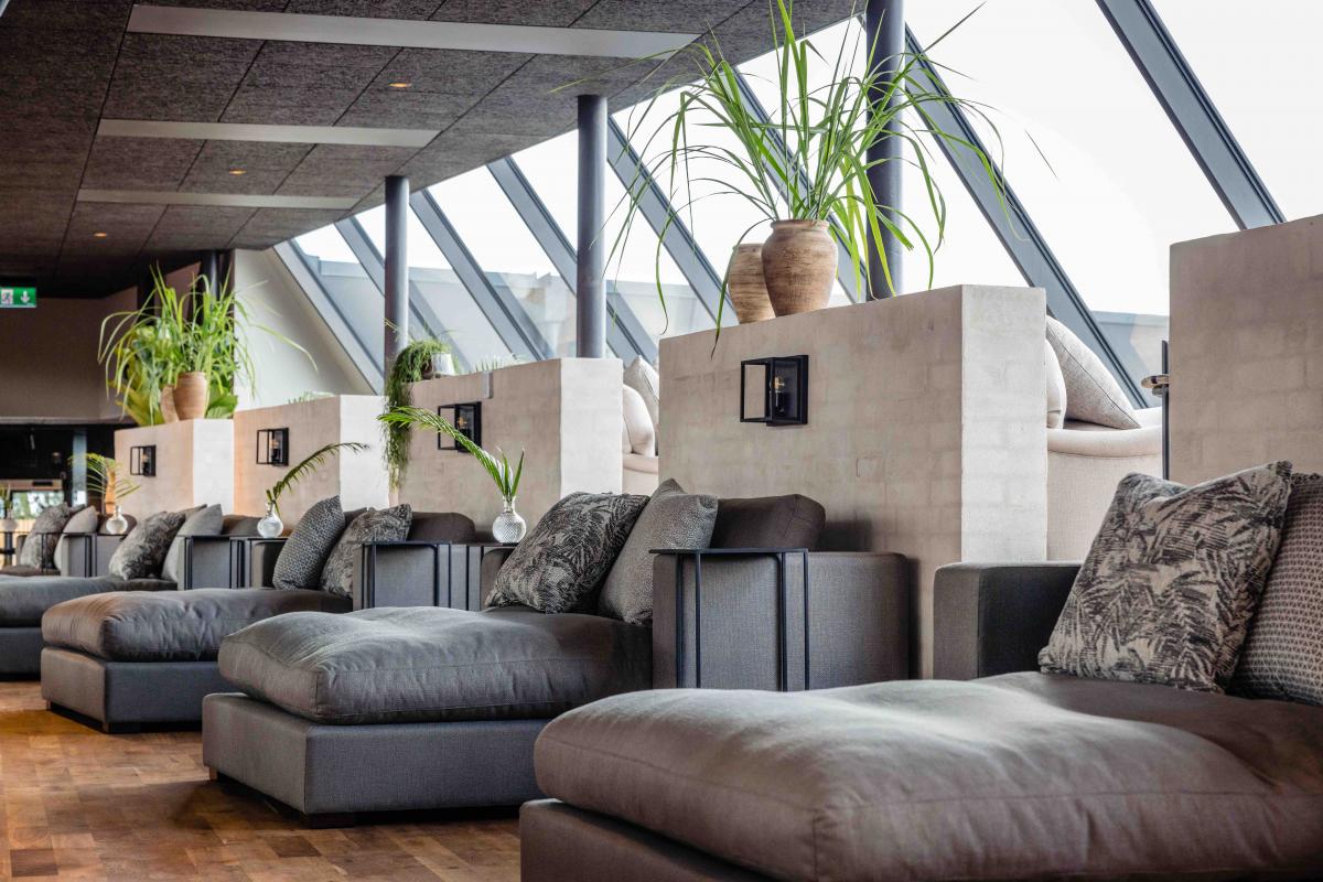 Inne i relaxavdelningens ombonade loungemiljö syns speciellt framtagna love seats från småländska Jio Möbler, egendesignade Skansenlampor, rustika bord och mjuka fåtöljer. Möblerna är tillverkade i naturmaterial och kraftiga tyger, i en dov färgskala som skapar harmoni. Inslag av mönstrad mosaik, svarta linjer och gröna växter ger en kolonial touch, som binder samman rooftopavdelningen med spalobbyn på nedre plan.